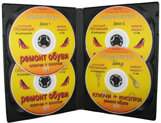 1-й DVD - Вы наглядно увидите весь процесс ремонта обуви по шагам: от покупки материала, приобретения инструмента, подготовки и заточки инструмента. Научимся нескольким видам прошивок и закончим этот диск на замене и установке различных видов латок.