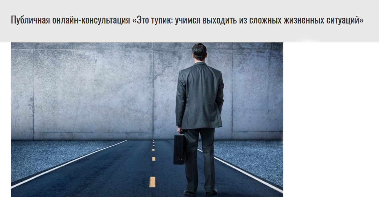 Чтобы во всём этом разобраться, приглашаю вас 10 октября в 19:30 (по московскому времени) на публичную онлайн-консультацию «Это тупик: учимся выходить из сложных жизненных ситуаций».