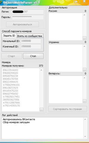При запуске появится ошибка, нажимаем Ок и работаем дальше. Разделяет номера по странам, может сохранять в текстовый файл. Парсит по даипозону или по сообществам.