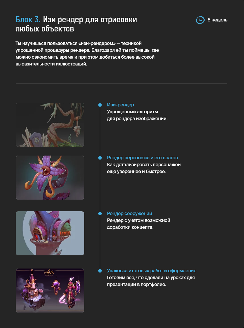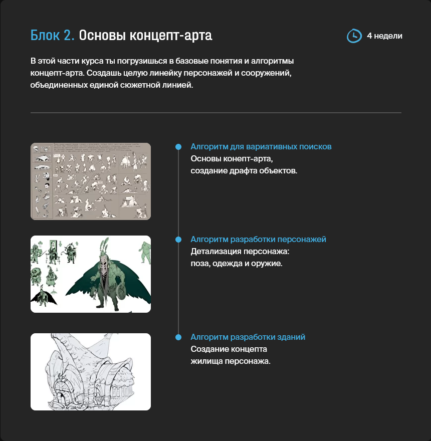 В этой части курса ты погрузишься в базовые понятия и алгоритмы концепт-арта. Ты создашь целую линейку персонажей и сооружений, объединенных единой сюжетной линией.