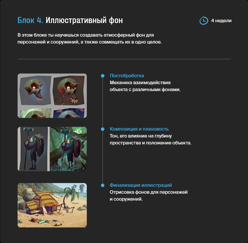 В этом блоке ты научишься создавать атмосферный фон для персонажей и сооружений, а также совмещать их так, чтобы они читались как части единого целого. Ты познакомишься со специальными кистями, навыками создания эффектов и прорисовки фоновых декораций для того, чтобы арт выглядел завершённым.